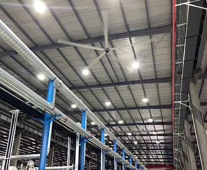 The large blades of High-volume, low-speed (HVLS) fans move large volumes of air at low speeds. Their extensive diameter makes them perfect for warehouses. These large ceiling fans help control temperature, improve air quality, and minimize the expenses on other heating or cooling devices.